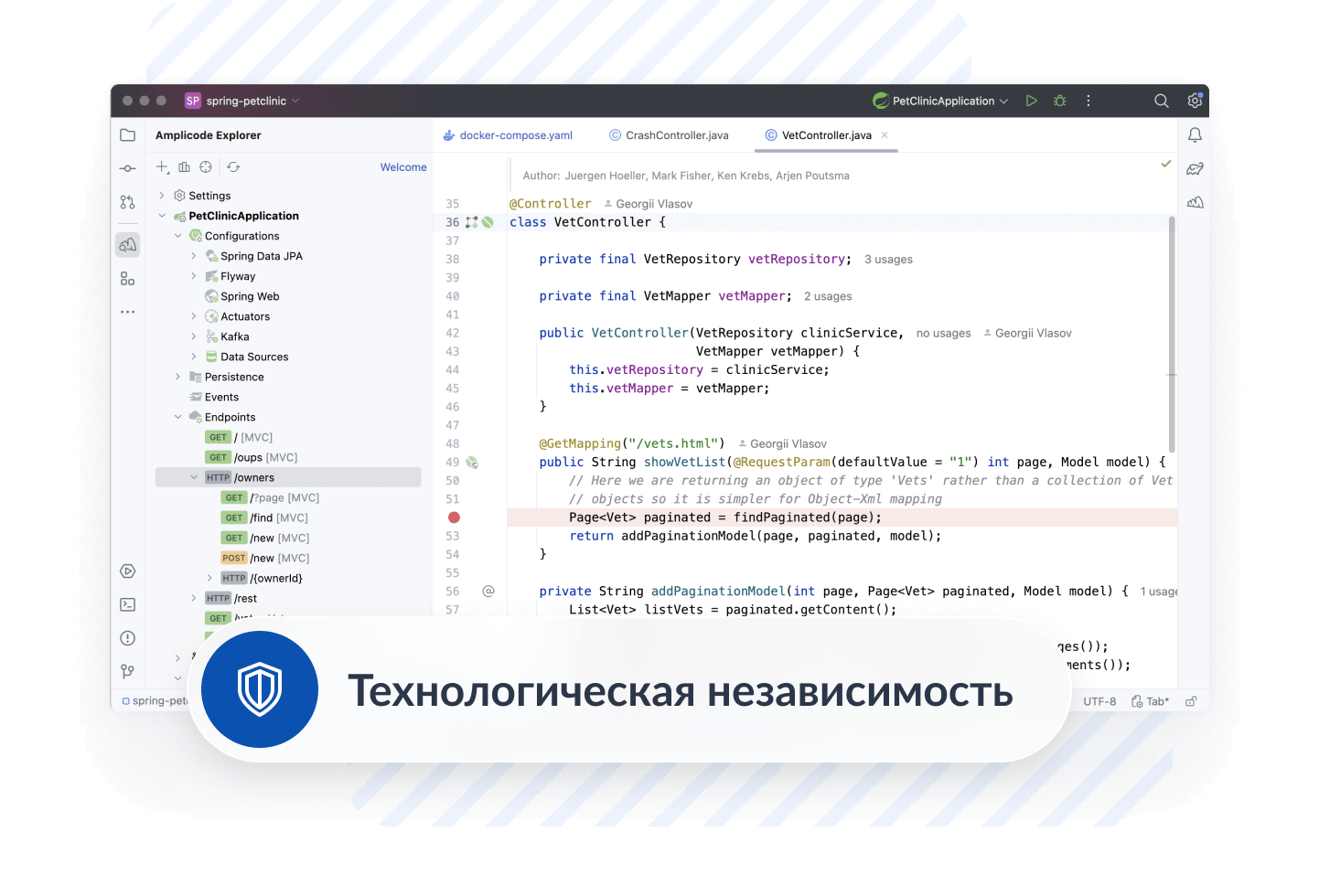 - Поддержка современных технологийOpenIDE обеспечивает полноценную работу с актуальными версиями Java и Kotlin «из коробки», без необходимости дополнительных настроек. Для Spring-разработчиков платформа предлагает расширенную поддержку с помощью Amplicode, включая функциональность, ранее доступную только в платной версии IntelliJ IDEA Ultimate. Специально разработанный Docker-плагин предоставляет полный набор инструментов для работы с контейнерами, а поддержка Python легко добавляется через встроенный маркетплейс плагинов.