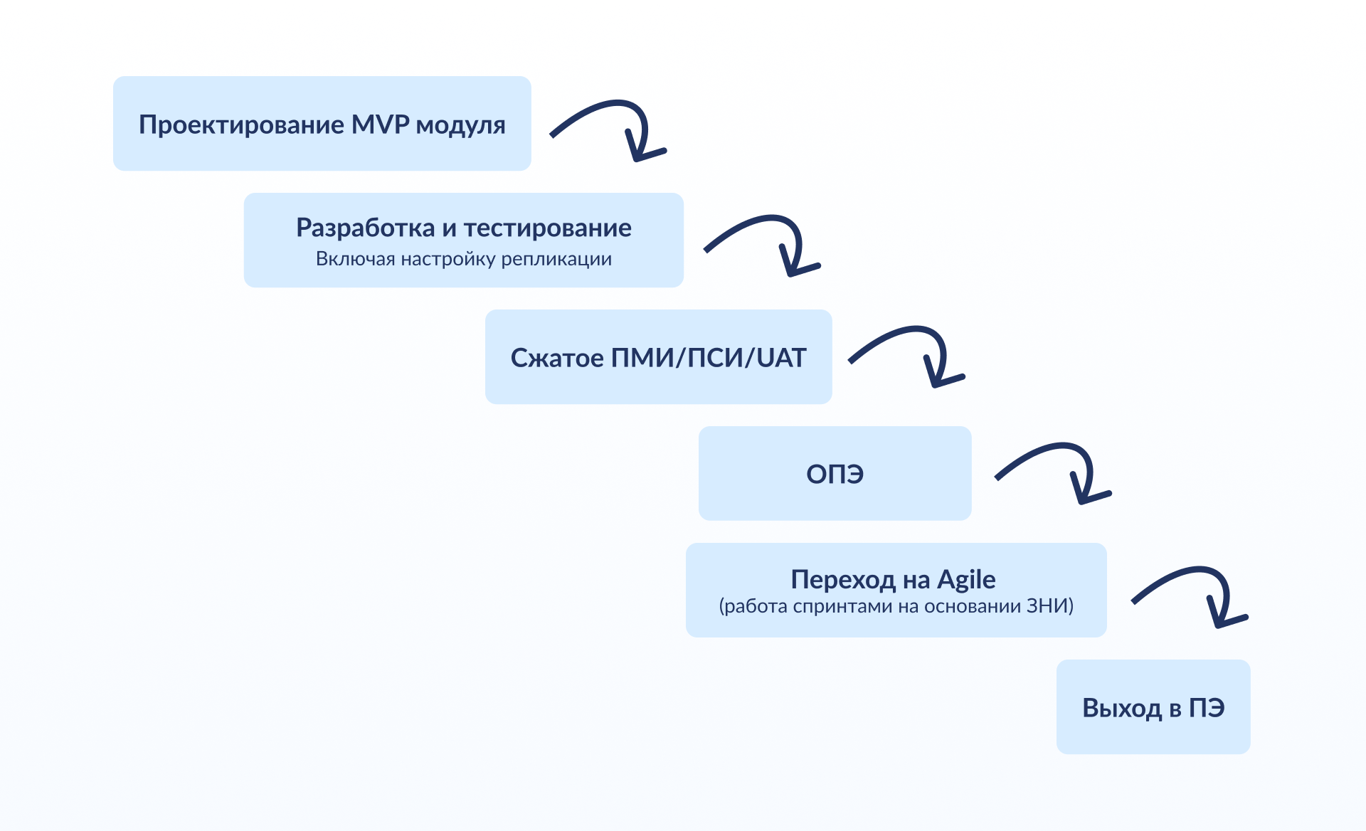- Проект делится на модули, у каждого отдельная команда, свои сроки разработки и вывода в ОПЭ