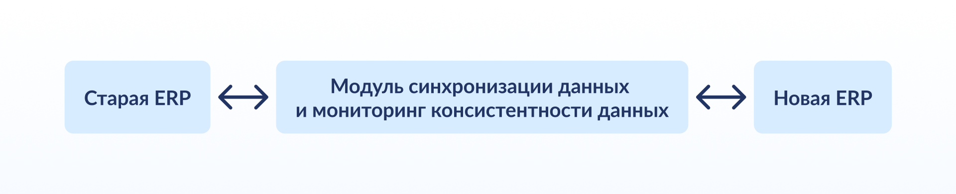 На время ОПЭ между старой и новой ERP появляется дополнительная прослойка — модуль синхронизации данных и мониторинга их консистентности. Это позволяет двум системам работать параллельно на логически едином наборе данных, который обновляется в режиме реального времени.