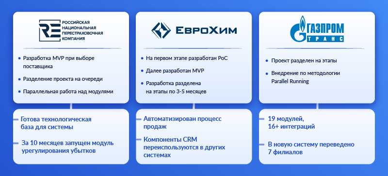 В проекте «Газпромтранс» требовалось заменить ERP на базе Pega, состоящую из 19 модулей и включающую свыше 16 интеграций. Сложность заключалась в том, что система критически важна для процесса ж/д перевозок и должна работать 24/7. Мы разделили проект на этапы и проводили внедрение по методологии Parallel Running. На каждом этапе стремились как можно быстрее запустить в эксплуатацию основную функциональность, включали синхронизацию старой и новой системы, а затем дорабатывали по методологии Agile в формате запросов на изменения. Это позволило не только снизить Time to Market, но и в принципе реализовать проект такого масштаба. Сейчас в новую систему переведено 7 филиалов «Газпромтранс»