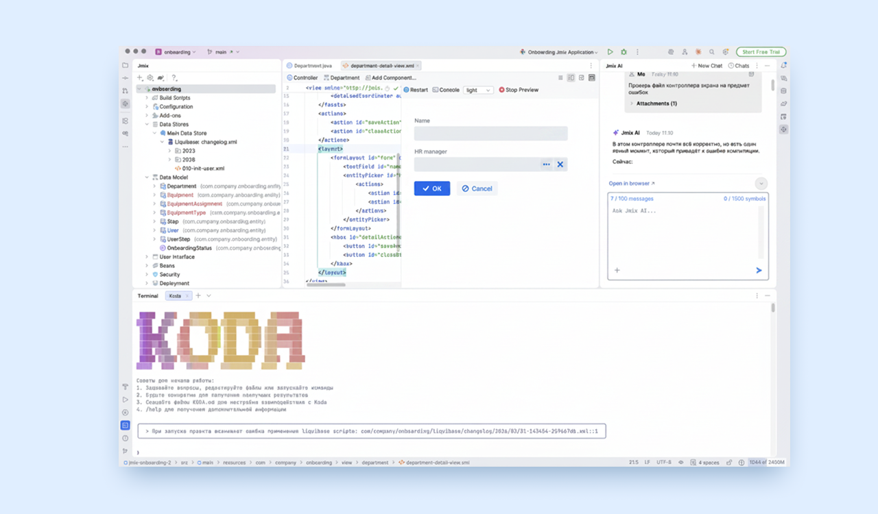 Фреймворк Джеймикс. Open source платформа с активным сообществом. Предоставляет архитектурный шаблон, проверенный на 3000+ корпоративных проектов за 10 лет. Повышает качество генерируемого кода за счет четкой структуры, которой придерживается агент.
