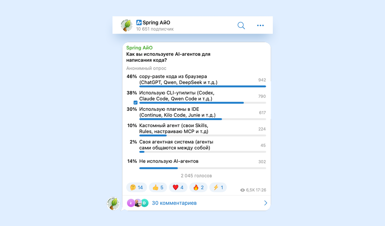 Агентное программирование позволяет увеличить скорость разработки не в 2–3 раза, а в десятки раз. Однако опрос, проведенный в популярном среди Java-разработчиков канале Spring АйО, показал, что оно пока не стало массовым. Только 13% из 1900+ опрошенных используют полноценные агентные решения, которые выполняют все этапы разработки от планирования до тестирования и развертывания. Почти половина респондентов — 46% — копирует в проект код из чатов с ИИ-моделями в браузере.
