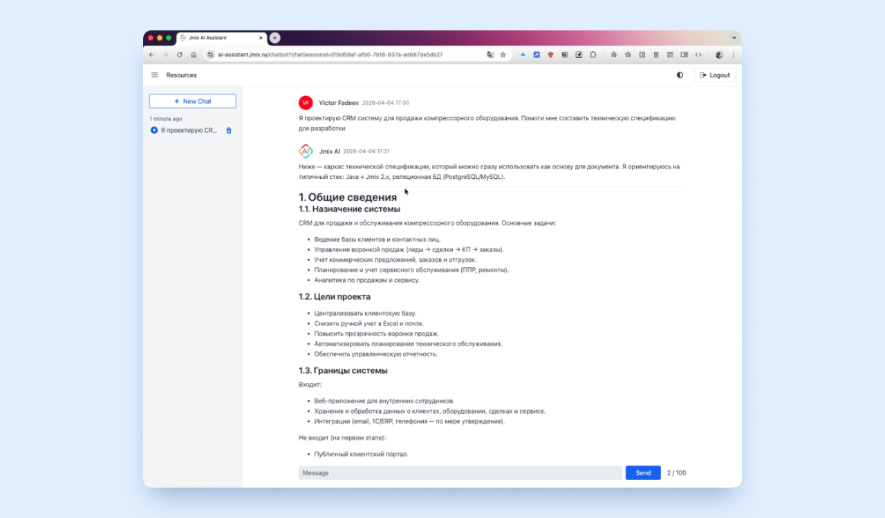 Джеймикс AI Assistant. Веб-приложение, построенное на базе технологий RAG. Разработчики и аналитики могут описать решение, чтобы получить спецификацию на базе архитектуры фреймворка Джеймикс. Снижает риск некачественного промпта на входе разработки.
